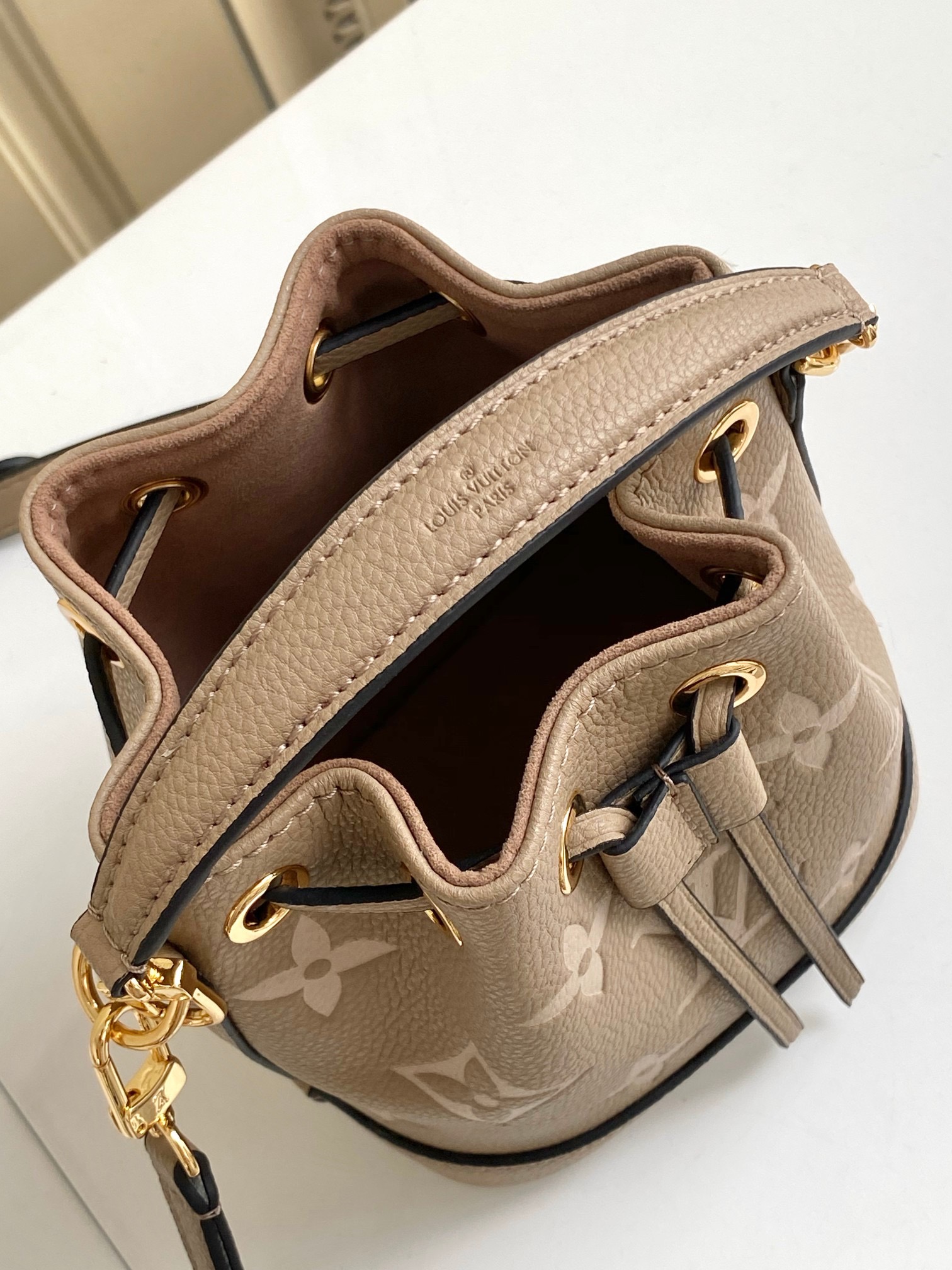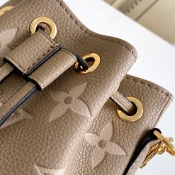 This bicolor version of the Nano Noé is crafted from supple Monogram Empreinte leather, embossed with the Monogram pattern. This miniature replica of the iconic Noé bag is a stylish way to carry everyday essentials. In addition to its practical drawstring closure, it features a removable handle and a removable, adjustable shoulder strap for different carry options.
