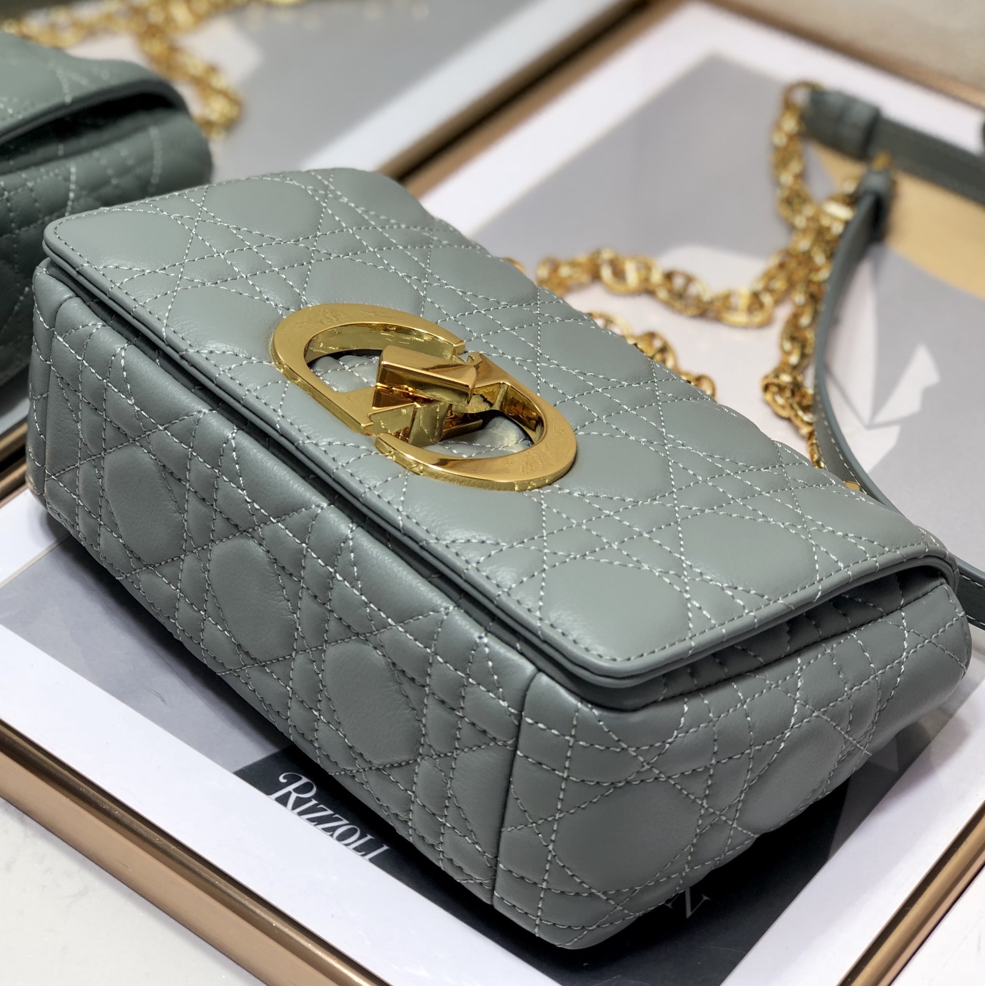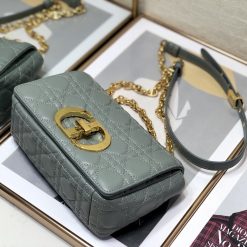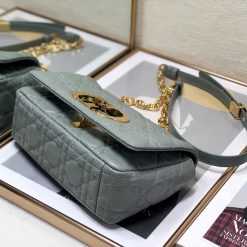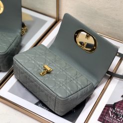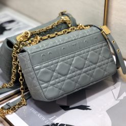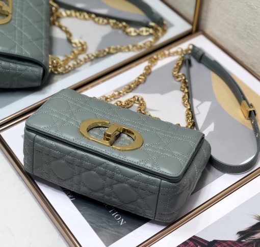 The Dior Caro bag combines modernity with timeless elegance. The design is crafted in gray supple with Cannage stitching. The bag features a flap adorned with an antique gold-finish metal ‘CD’ twist clasp. inspired by the seal of a Christian Dior perfume bottle. The detachable chain shoulder strap with ‘CD’ signature links allows it to be carried by hand. over the shoulder or crossbody. or replaced by one of the House’s wide embroidered straps. allowing the small bag to pair with day or evening attire.